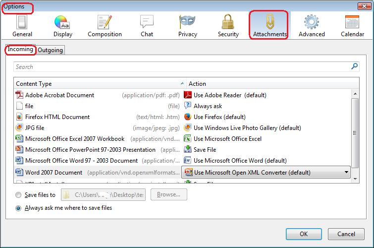 'Menu icon' > 'Options' > 'Options' > 'Attachments' > 'Incoming' tab it should look similar to image below. Content Type eg: JPG file, to the right will be the action. Click on that action to see other options. Select the one you want and click on OK