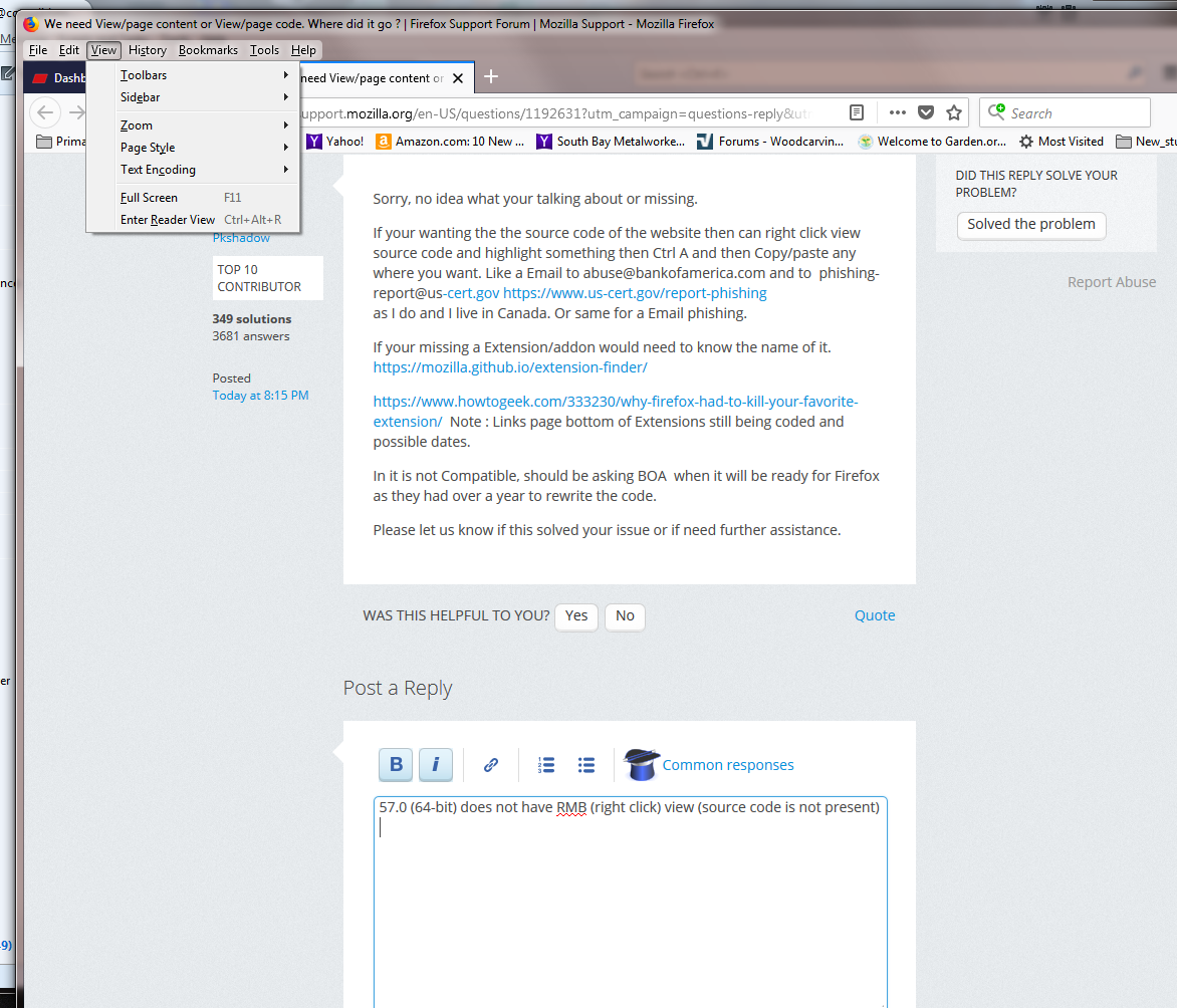 57.0 (64-bit) does not have RMB (right click) view (source code is not present) I have added an image for you to see. Prior versions since who knows when all had that option for reporting abuse sites to anyone. BOA is Bank of America.