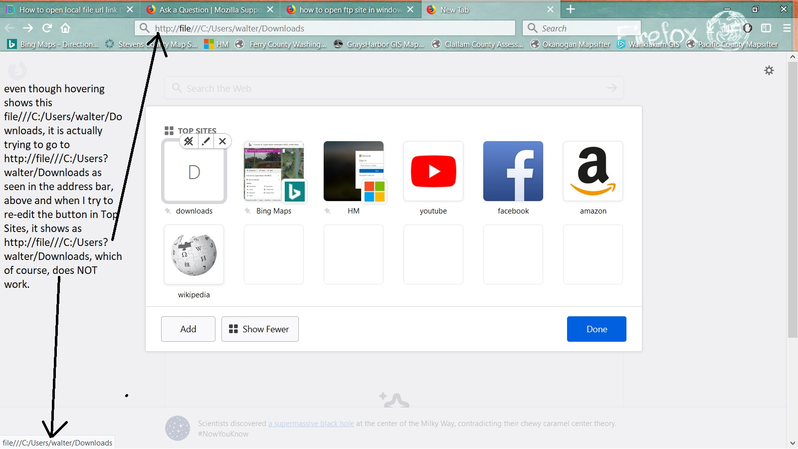 trying to edit top sites button in new tab. even though hovering shows this file///C:/Users/walter/Downloads, it is actually trying to go to http://file///C:/Users/walter/Downloads as seen in the address bar, above and when I try to re-edit the button in Top Sites, it shows as http://file///C:/Users/walter/Downloads, which of course, does NOT work. it always seems to add the HTTP:// and I am not sure if this is a limitation of how Top sites works. any ideas? Thanks, Walt