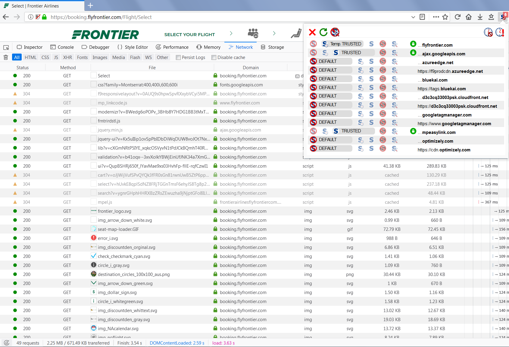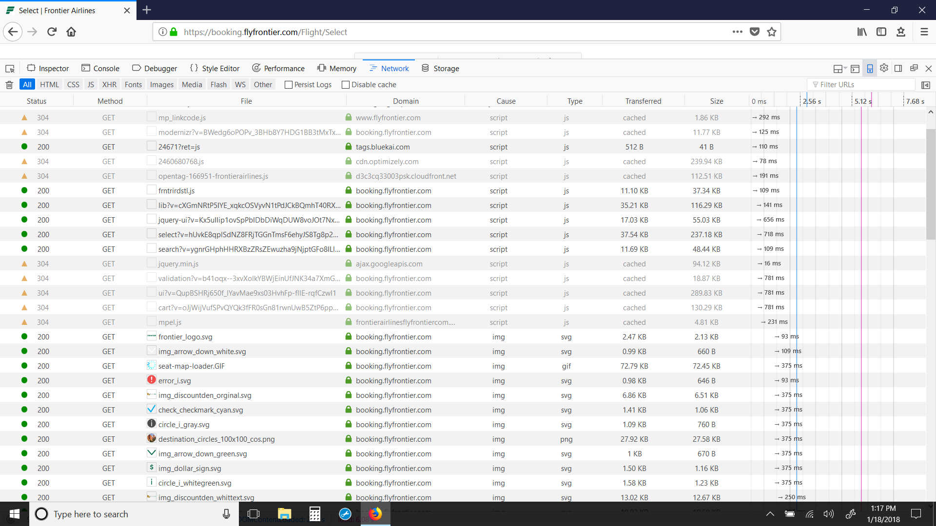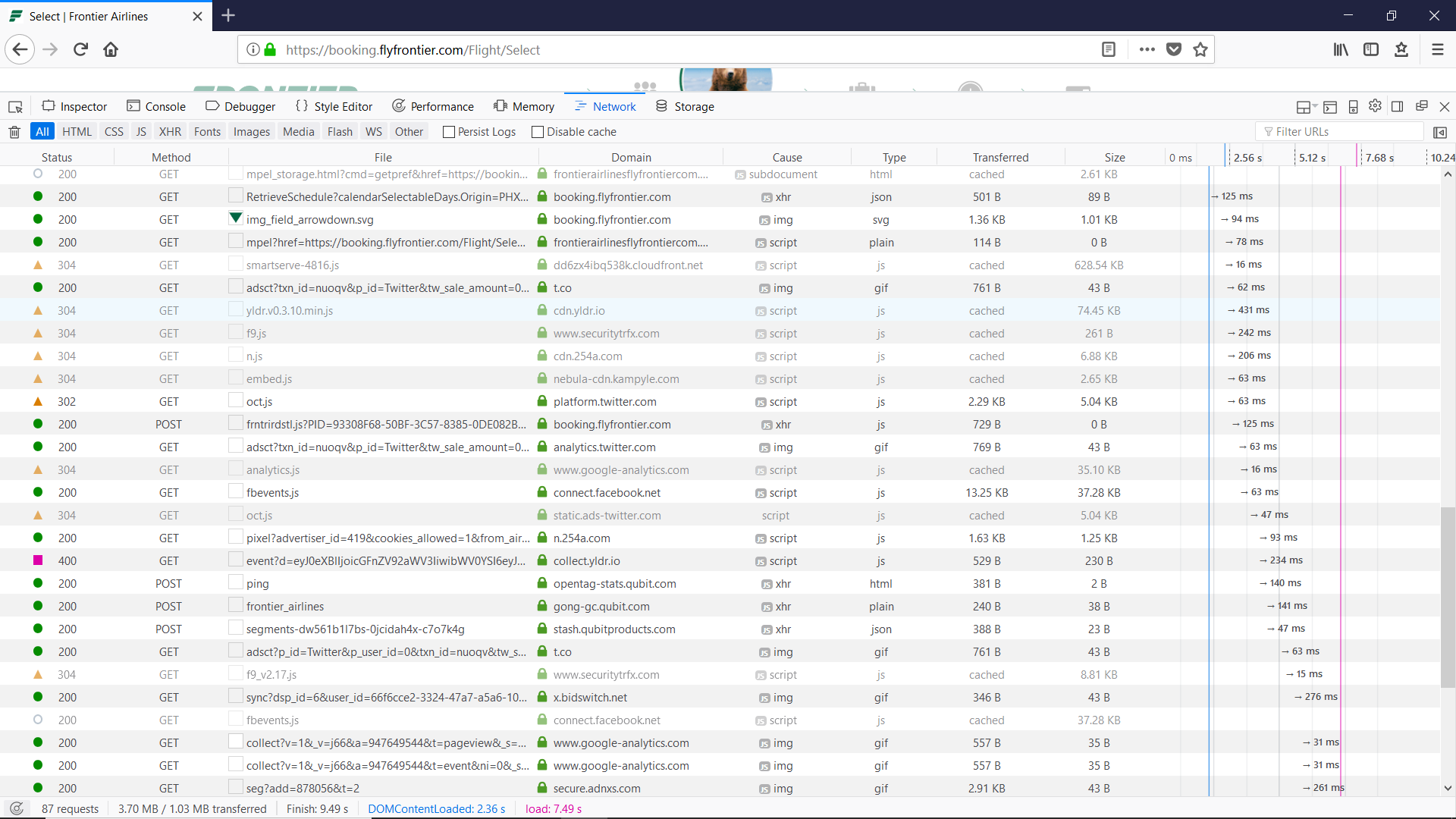 After entering your cities and dates and clicking the button to proceed, Firefox should start filling the list with various requests that it makes and the status. 200 is success, a green dot indicates a fresh retrieval and an empty circle indicates a file used from cache. I am attaching a screenshot of the first half of the long list of files retrieved. Do you see any statuses other than 200 or 301/302 (redirect)?