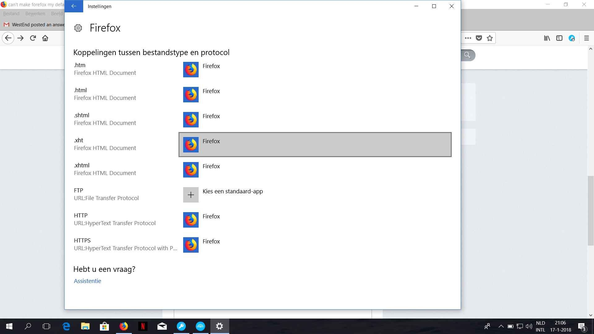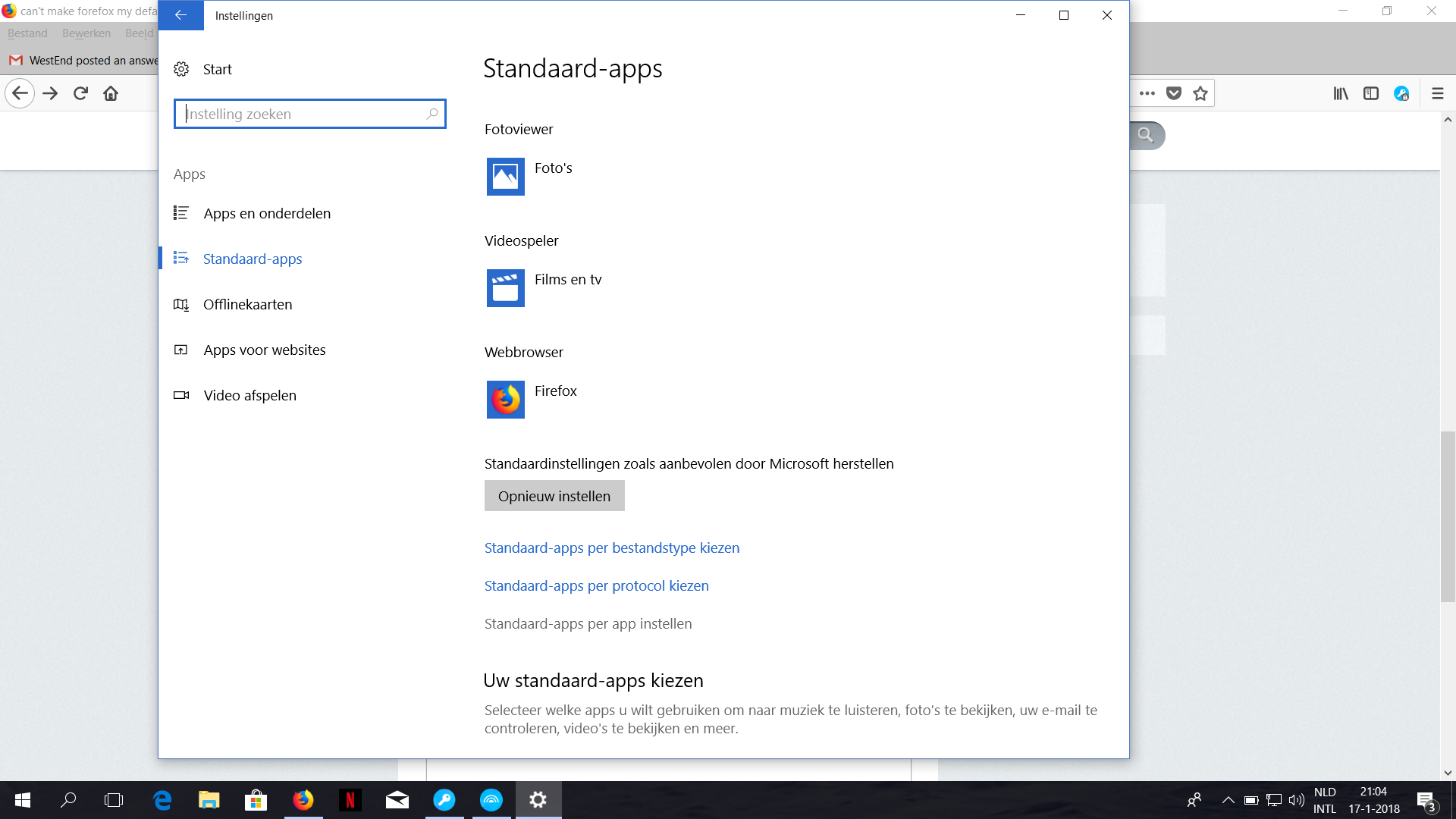 Somewhere in system-settings i found the option to set per app which files you would like to handle by each specific app. (it is in the section to set defaut apps, and then choose "default app per app" Then you can select firefox, en then which files you want to handle by FF. various were allready linked to FF, others to Edge. After i linked all to FF, FF was my default browser :-)
