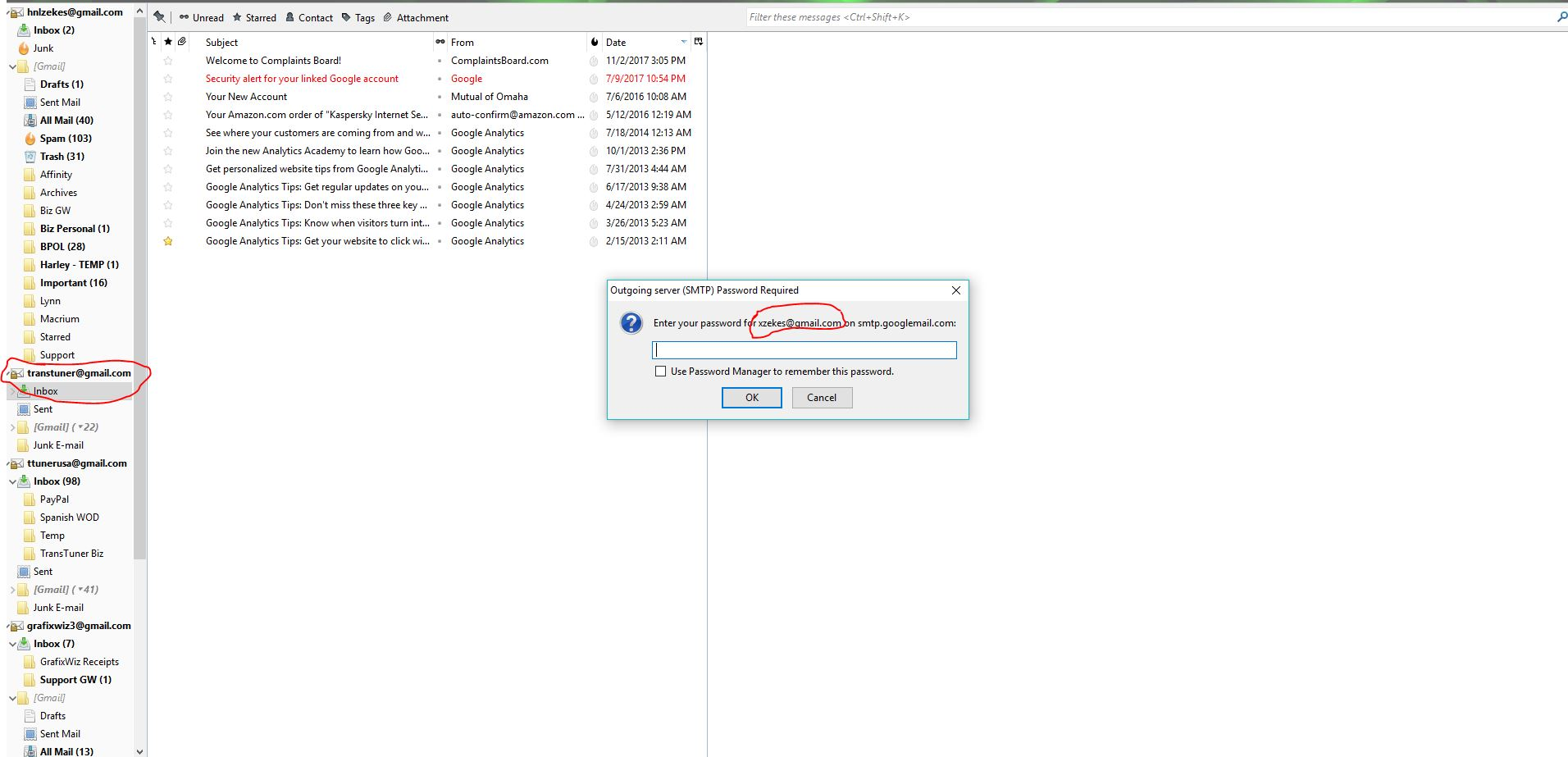 Further, I discovered when trying to send a message from one account to another to illustrate the problem, that TBird is quite confused. In one of the screenshots, TBird is trying to send a password for a server for an email account that I closed months ago. That account does NOT appear in Account Settings. You can see the account does not match the account that I was trying to send the message from.