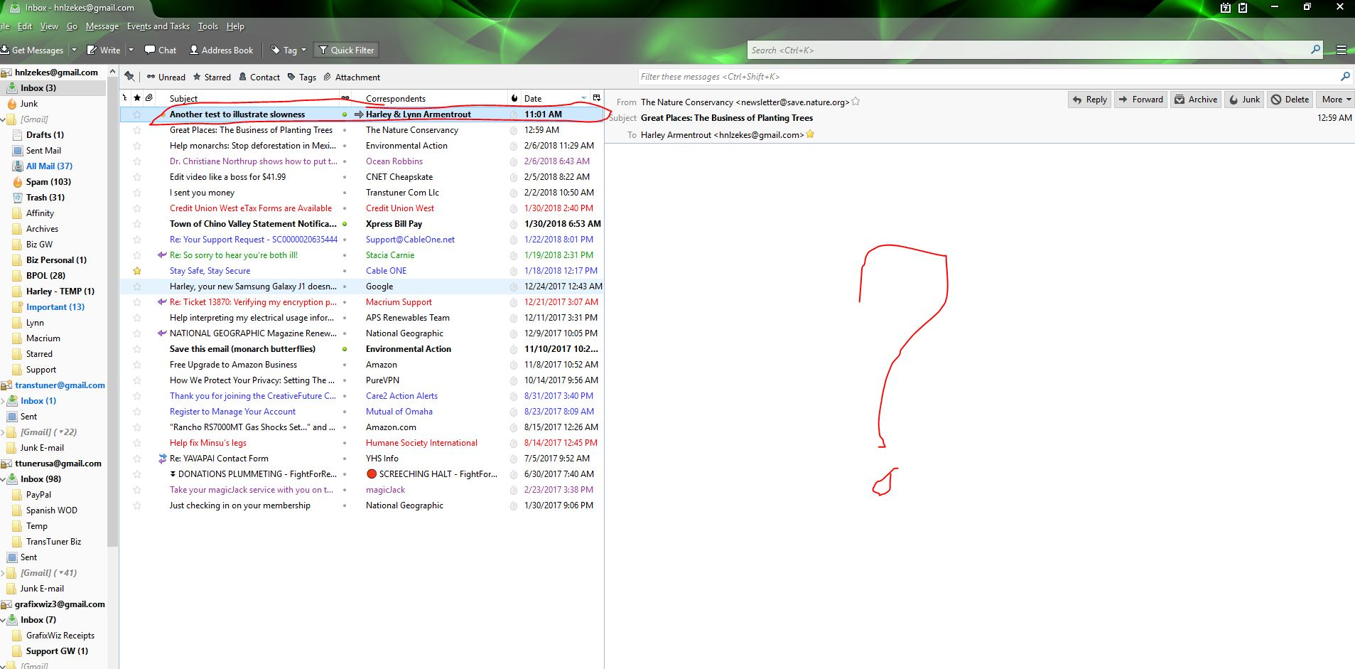I have four Gmail accounts. The Inbox for just one of those accounts has suddenly started to load very slowly. The little Windows busy signal goes around and around most times when I open TBird or when I move back to that Inbox folder from another folder. When a message finally does appear, the subject and sender notification appear but it takes FOREVER for the actual message to appear.