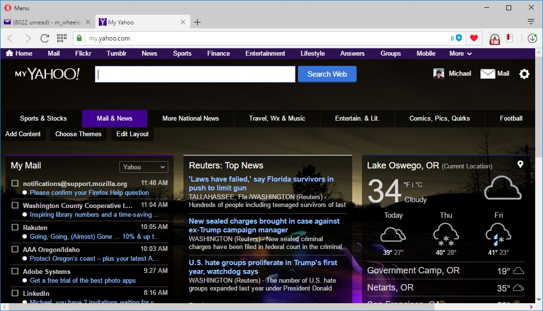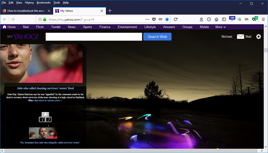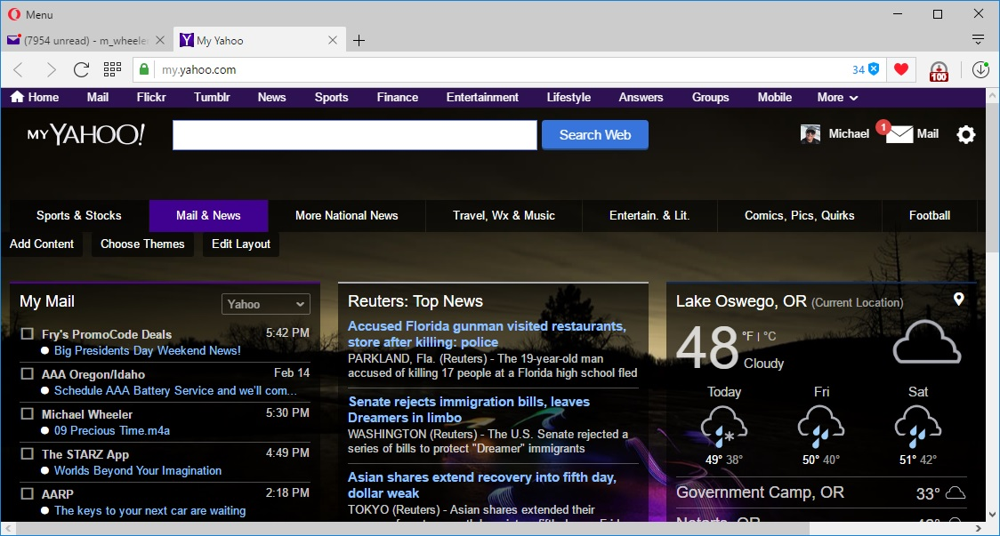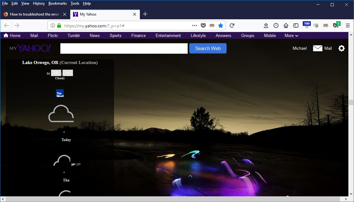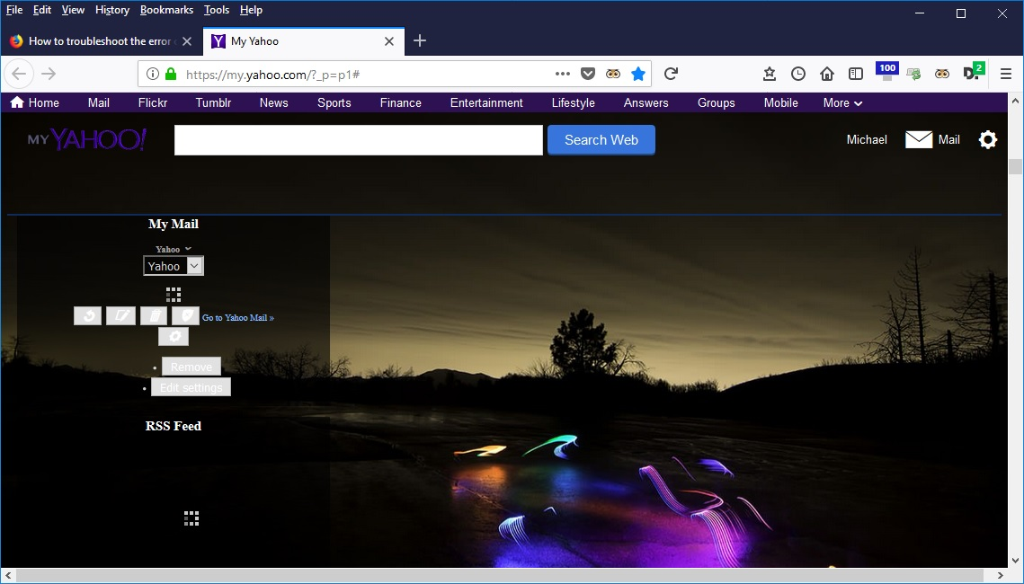 Also, the My Yahoo issue may have been caused by Yahoo, and the correct appearance was restored in Firefox by 2/24/2018. All other browsers were displaying the page correctly during the Firefox anomaly. The fact that other Firefox users were having the same issue with the My Yahoo page may have led to action by Yahoo, or by Mozilla.