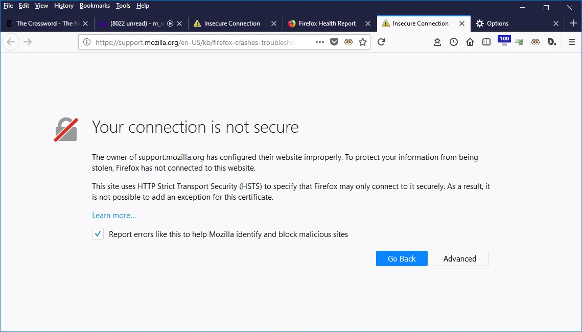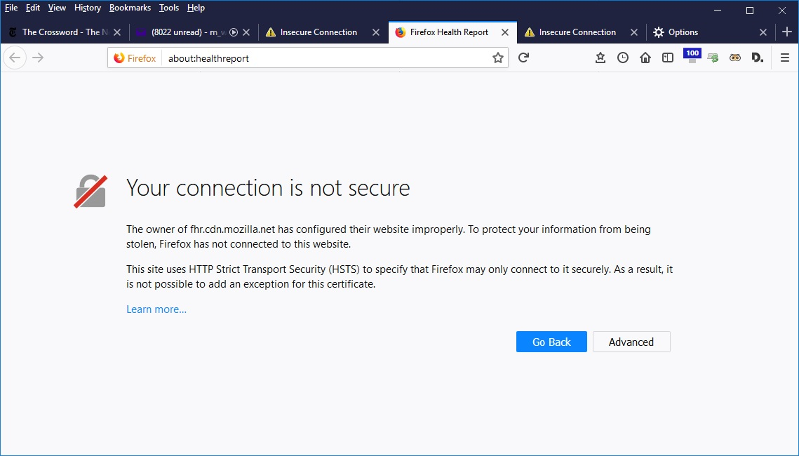 Now, today, in trying to capture images of the page, I am finding that Firefox is performing an overly aggressive security review, and preventing sites that normally are displayed properly, from being displayed at all! Now I can no longer provide images to illustrate how some of the data was displayed, incorrectly, as a security certificate warning has taken its place (provided). I am including screen shots of all of them.