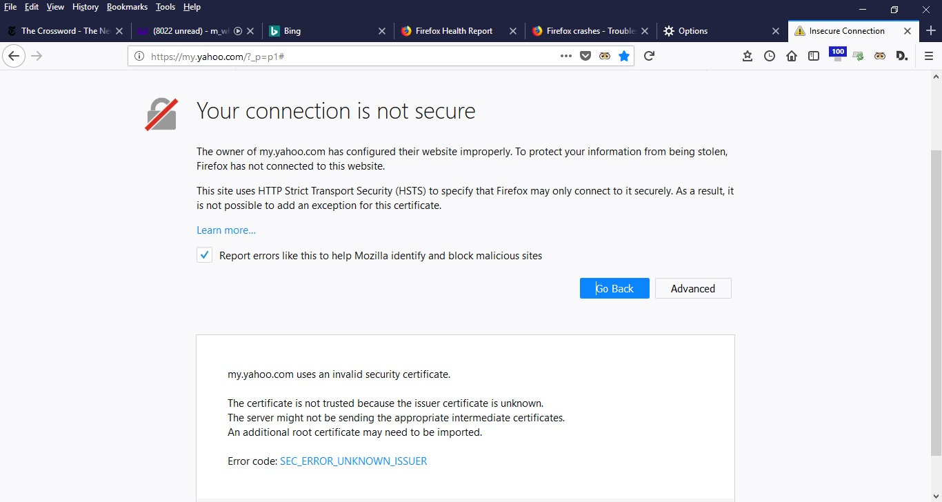 Thanks for your prompt reply, jsher2000. I appreciated reading your suggestion. However, I should not have included two issues in the same post. The primary concern was the My Yahoo page anomaly. The certificate issue seemed to appear as I was trying to capture relevant screen shots, and curiously included attempts to view Mozilla web pages. Anyway, that issue seems to have resolved itself with no action on my part,