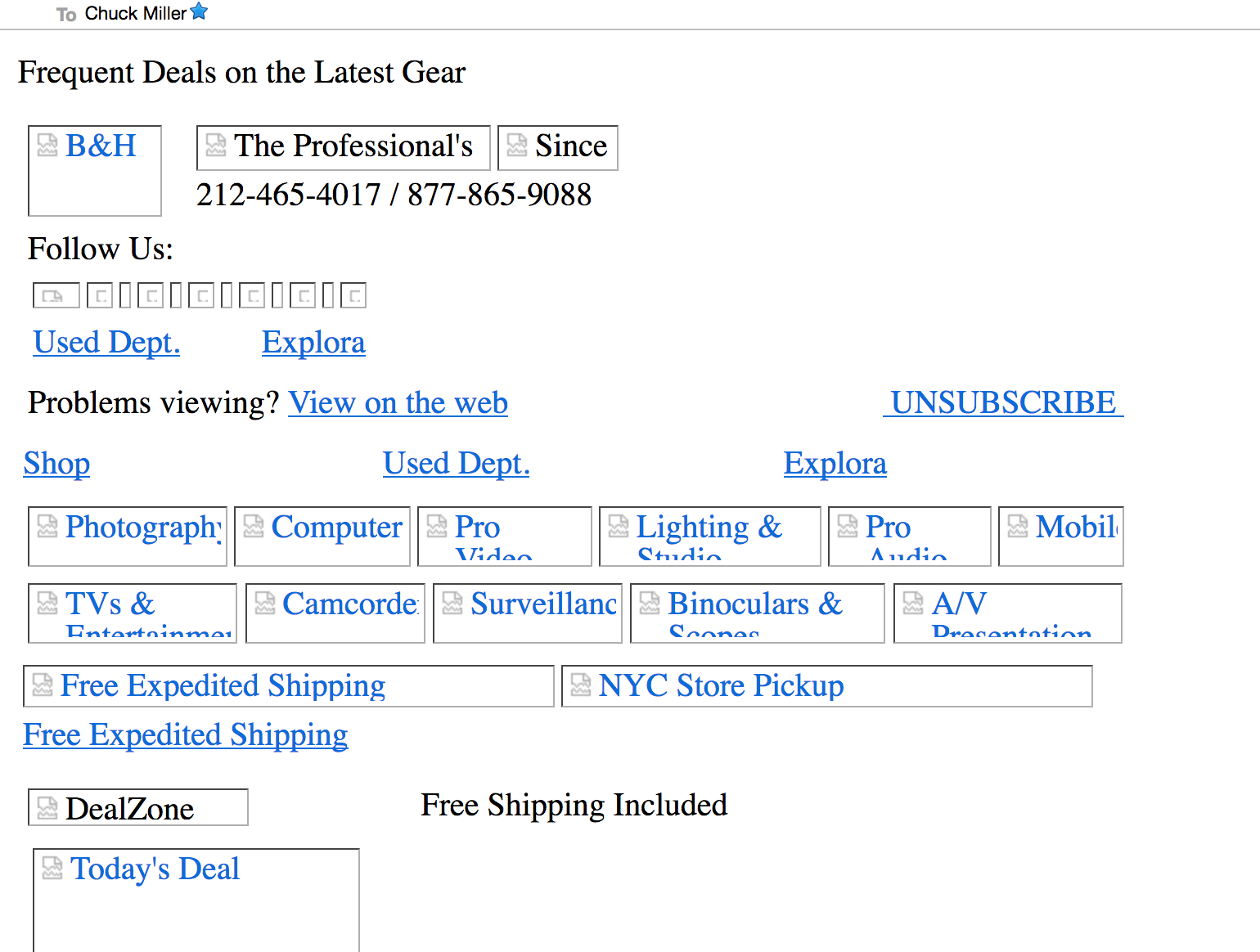 My InBox displayed messages have suddenly lost display with the embedded graphics, as though I was not using HTML, and trying to minimize file content (like on older computers. All graphic content shows a frame with the Broken Image icon). [See attached screenshot Image] I have confirmed that my Thunderbird is communicating with the Internet, and if I bring up my gmail account through the Internet, it displays correctly, as it always has until the last couple days. I cannot foind anything in the TB Preferences or accounf settings to explain this. I have rebooted the computer several times, closed and re-opened TB several times, and nothing corrects this. I am running TB version 52.6.0 (upgraded on 2/10/18) on an iMac (5K 27" late 2014) running Mac OS 12.12.5. Any suggestions? __ Chuck av8or.usaf@gmail.com