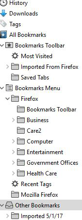 They're in a couple different folders, the ones I use most, of course, are not with the others. It is a large folder that I tried to copy and paste into the right spot. Didn't work. Some are under Bookmarks Toolbar, some are under a Firefox folder, I have two of those. Main reason is at one point I had to uninstall the browser, when I did, I reimported the bookmarks from another browser and ended up with a mess. Which I'd like very much to simplify and get everything in just one place again. Any ideas on how to do that? Thanks! I've included a snip of what it looks like from the history library, can't use the snipping tool to grab the actual look, but this IS what the situation is. :^)