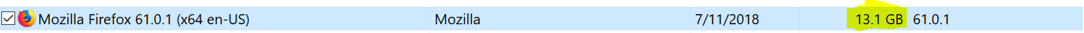 Firefox is taking up a whooping 13.1 gigs of storage in the windows uninstaller. Is this some kind of installation error or is this supposed to be the actual amount of storage it takes up?