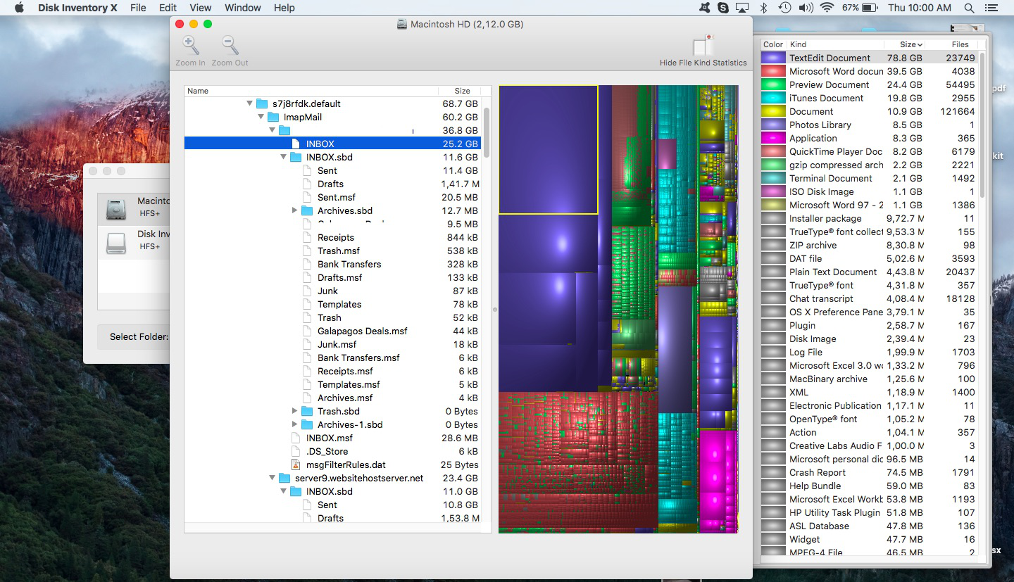 I received the dreaded "Your startup disk is almost full" notification and ran Disk Inventory X. Seems mail under Thunderbird is taking up a massive amount of space on my machine.