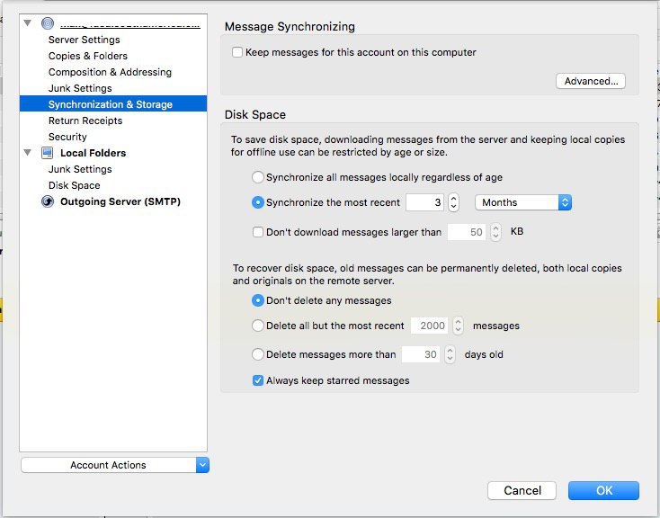 Hi there -- I'm using Thunderbird 52.9.1 IMAP on my macbook (capitan) and am having some serious issues with storage.