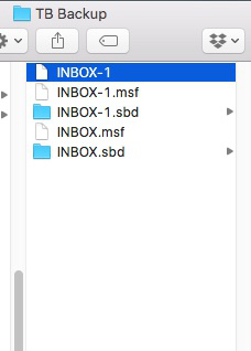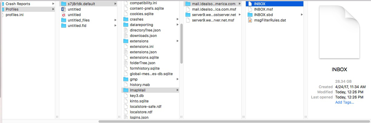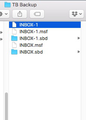 Access profile mail account name. eg: mail.ide....etc If you have space put a copy of Inbox. Inbox.msf and Inbox.sbd into 'TB Backup' - as Inbox.sbd contains all your 'Sent', Dratf etc - it should mean all your files get copied. Then delete those three (Inbox. Inbox.msf and Inbox.sbd), so there are no folders and no .msf files. Deleting Inbox.sbd should remove all those subfolders. The only file you need to leave in the mail account folder is the msgFilterRules.dat in the mail account name Start Thunderbird.