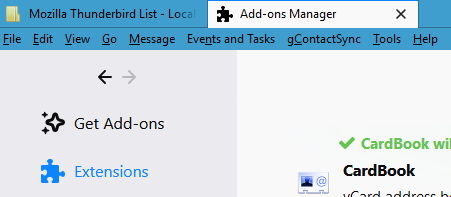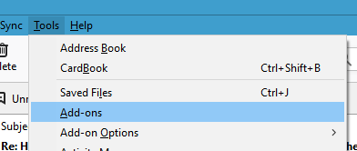 BTW: You can enable the 'Menu Bar' toolbar, if you prefer to see it. 'Menu icon' > 'Options' > select 'Menu Bar' This will then show the 'Tools' option as previously mentioned. Alternative: On the 'Mail Toolbar' toolbar, far right, there should be a menu icon that looks like it has '3 lines'. Click on the 'Menu icon' and it will have drop down menu on which you will see 'Add-ons' Click on 'Add-ons'. A new tab will open called 'Add-ons Manager' Select 'Extensions in the far left column, it has an icon that looks like a jigsaw puzzle piece. click on the gear wheel icon and select 'Install addon from file' select the xpi file you downloaded and click on 'Open This will install the addon. Make sure addon extension is enabled. You may need to restart Thunderbird after installing for it to take effect. In the image below, on the 'Mail Toolbar', I have moved my 'Menu icon (3 lines)' over to the far left as it seemed more logical to me, but you may find it positioned by default on the far right. It will show you the 'Addons' and also 'Options' which includes the option to switch on the 'Menu Bar' toolbar.