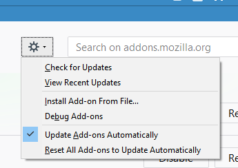I dont have the Addons manager in the addons group.. I dont see that on the right on the side of the screen.. And that menu doesnt escape me its just not there.. on the left of the mozilla search there is nothing with the gear icon..