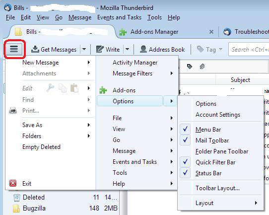 In the image below, on the 'Mail Toolbar', I have moved my 'Menu icon (3 lines)' over to the far left as it seemed more logical to me, but you may find it positioned by default on the far right. It will show you the 'Addons' and also 'Options' which includes the option to switch on the 'Menu Bar' toolbar.