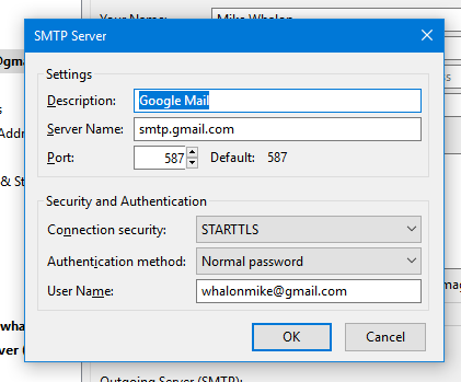 Suddenly this morning (21Mar2019), I am unable to send email using Thunderbird. Normal Gmail appears to function fine. I have exhausted the typical suspects (firewall, antivirus, etc.). I don't understand how this can be functioning perfectly fine for weeks/months/years, and then suddenly cease to function. Any thoughts on this matter are greatly appreciated.