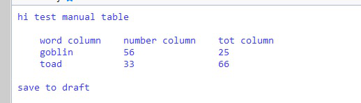 I created the table manually using the space-bar to space. Nothing fancy, just plain text all around (such as it is in non-HTML compose-option in T-Bird).