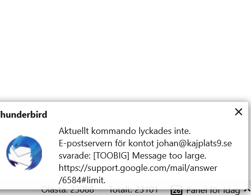 I want to move downloaded mails (from my old email) to my new mail in gmail. But after 1085 (Of 23088 mails) I get a message that cancels the migration. See picture.