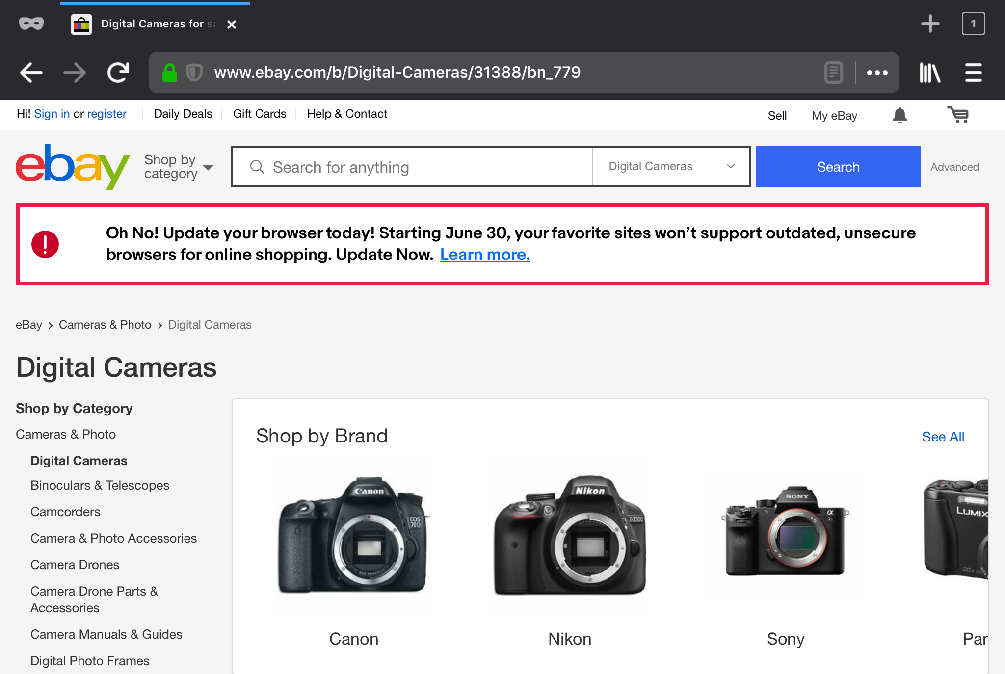 Complete warning: At eBay, your data security is very important to us. It looks like you're using an older web browser, which may not provide the security you need to buy or sell on eBay. Update your computer’s browser now by downloading the latest version.