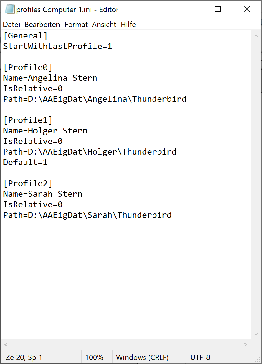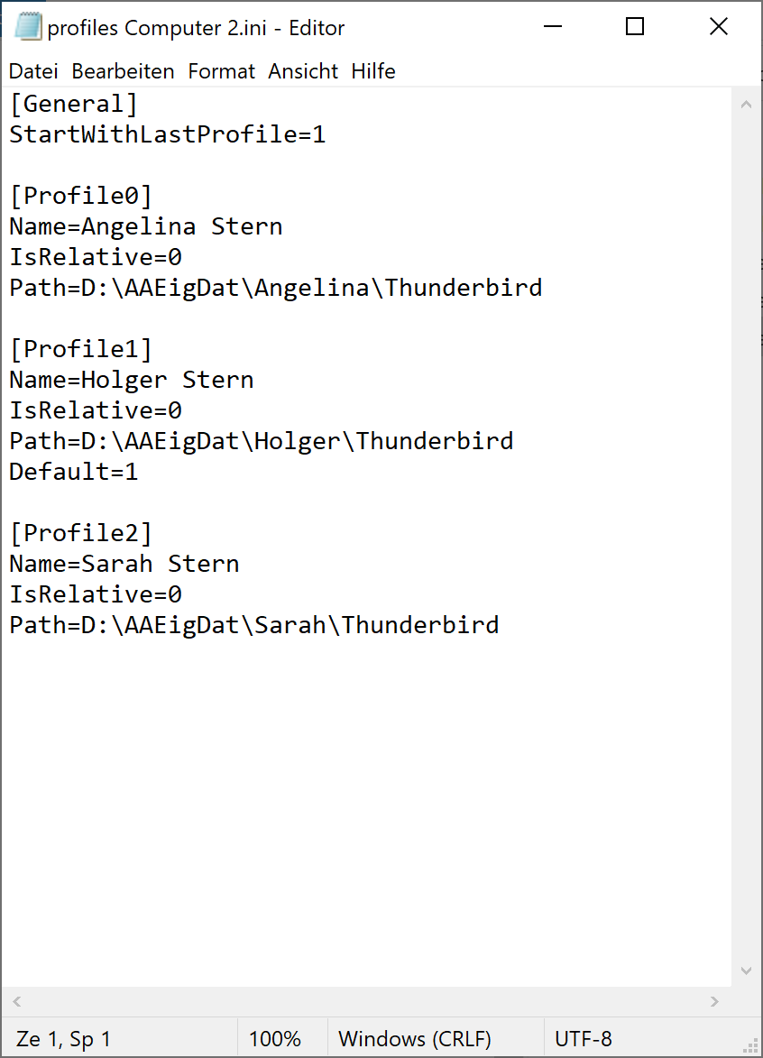 Copying the profile.ini from computer 2 to computer 1 does not help either (mail accounts are stored on a NAS, therefore the path to the mail accounts is the same).