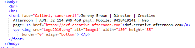 !DOCTYPE HTML> html> style> p {font-family: calibri,sans-serif; padding: 0px; margin-left: 10px; font-size: 14px; } img {margin-left: 110px;} /style> p> Jeremy Brown | Director | Creative Afternoon | ABN: 32 114 949 450 /p> p> Mobile: 0418419141 | Web page: a href='https://dxf.creative-afternoon.com/'>dxf.creative-afternoon.com/a> /p> p> img src="https://dev.creative-afternoon.com/CreativeMk2/images/Logo2019.png" alt="C-A DXF logo" align="bottom" width="180" height="85" border="0"/> /p> /html>