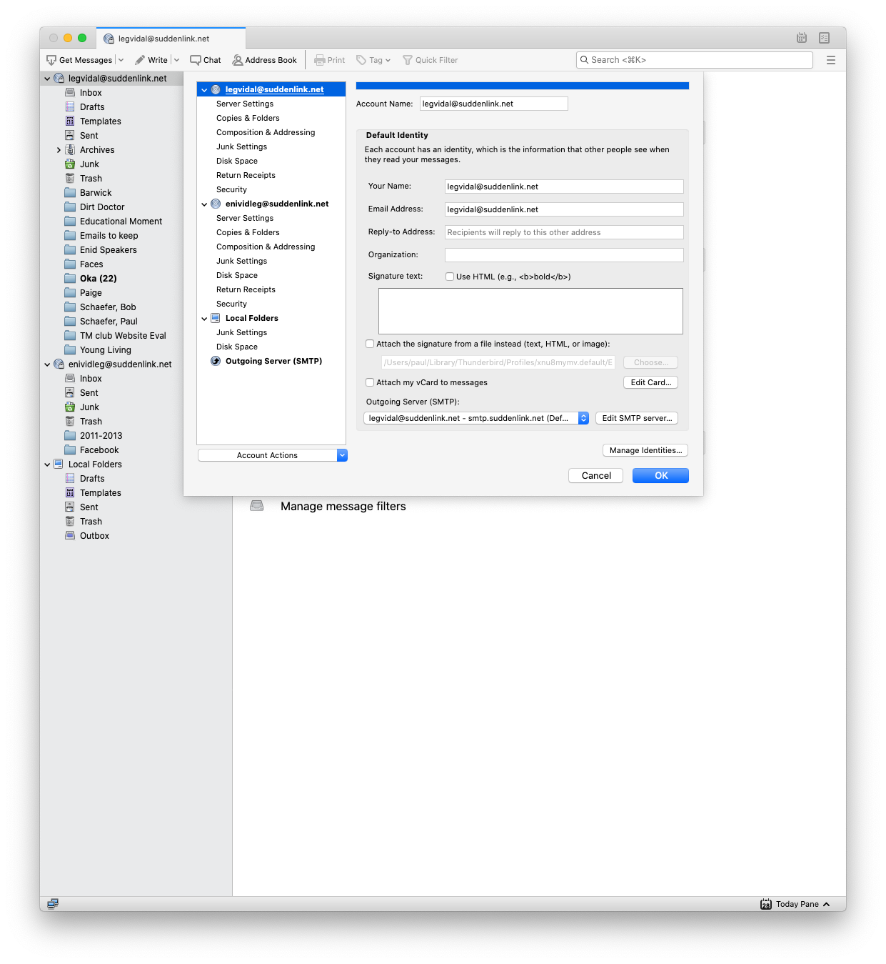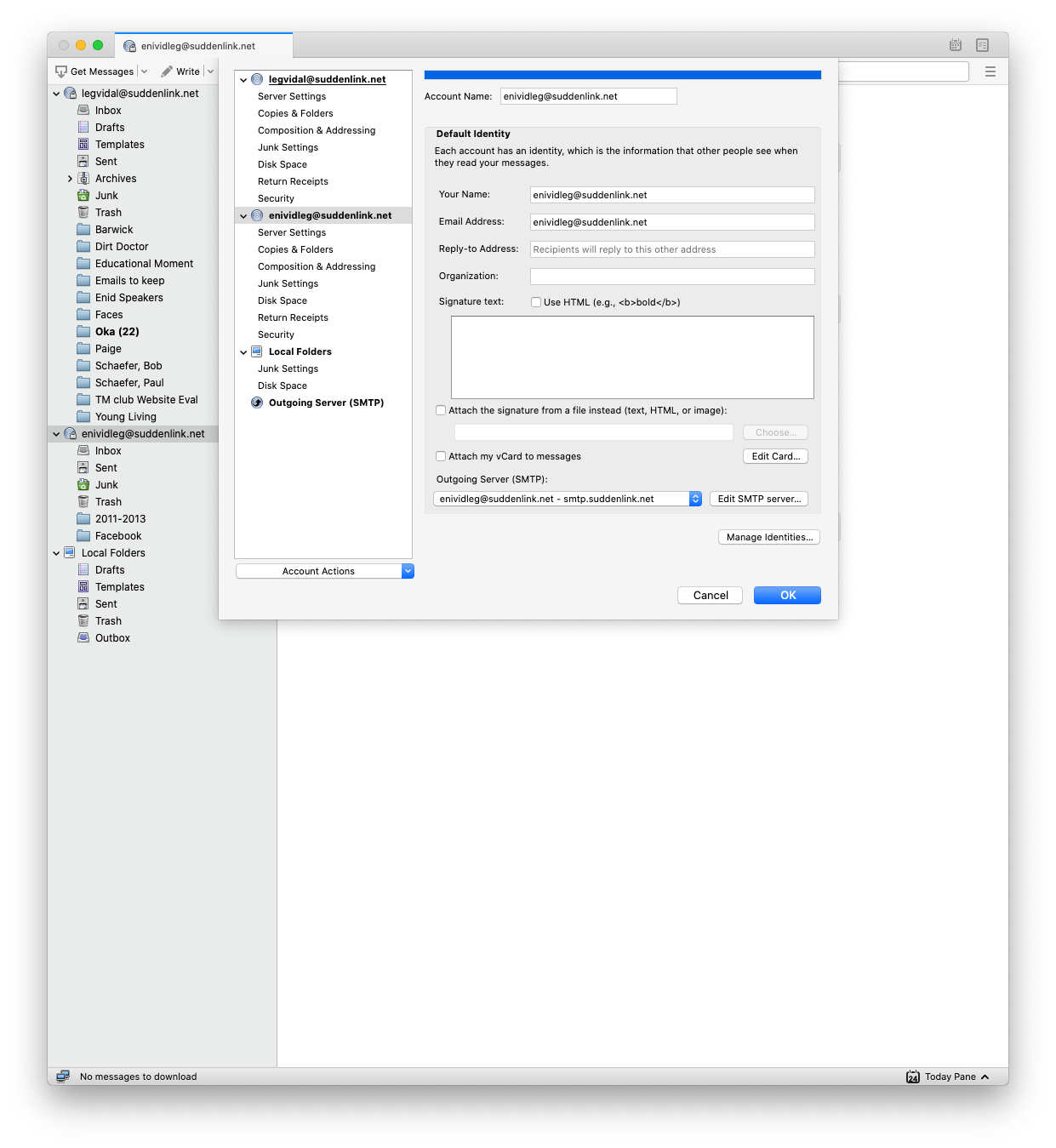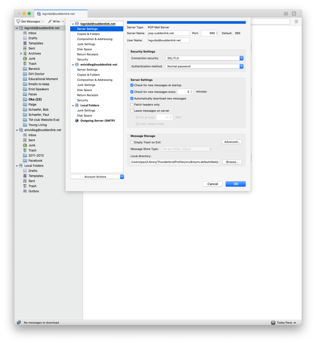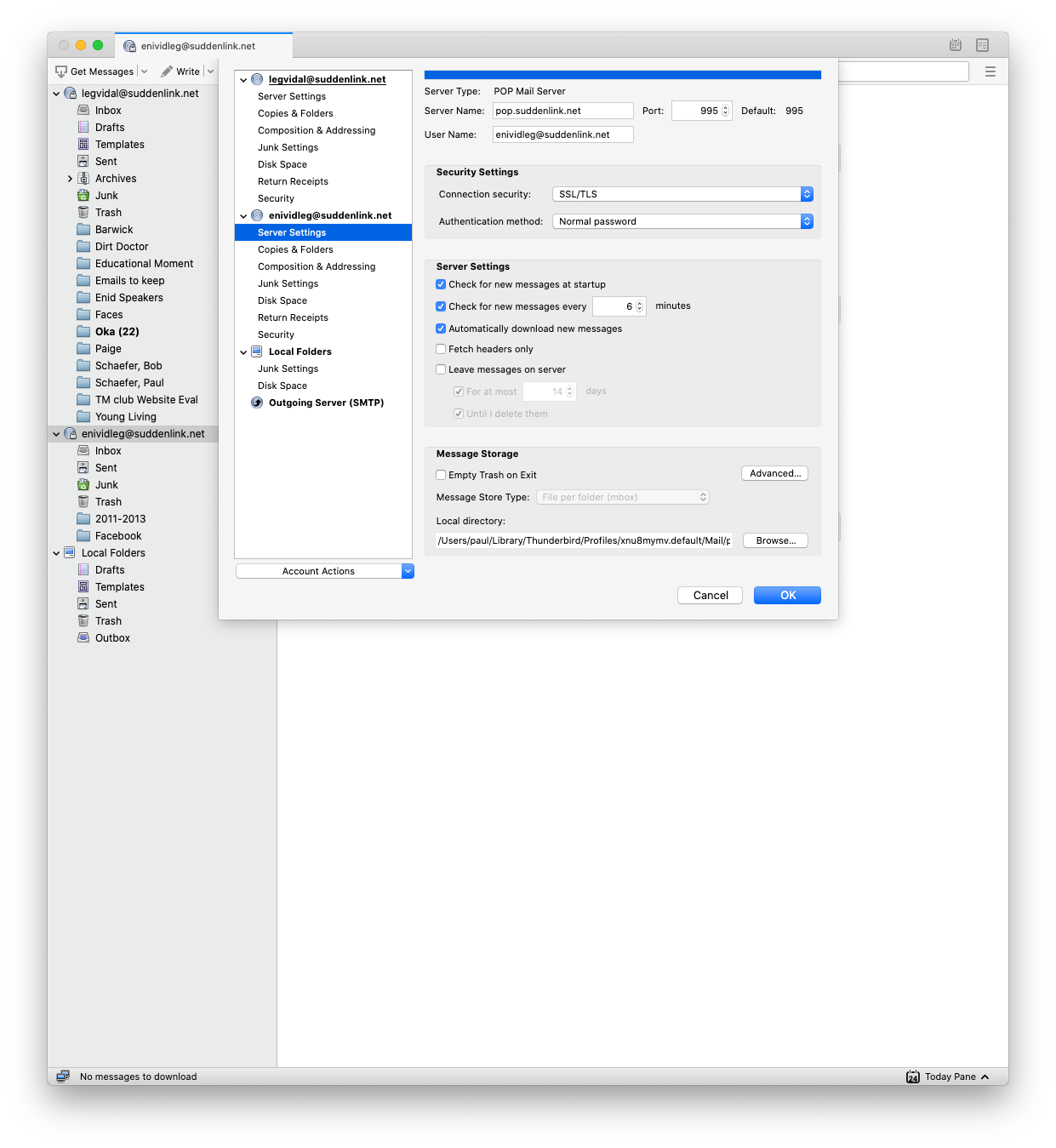 Mail and News Accounts Incoming server ID Name Connection security Authentication method account2 (none) Local Folders plain passwordCleartext account7 (pop3) pop.suddenlink.net:995 SSL passwordCleartext account8 (pop3) pop.suddenlink.net:995 SSL passwordCleartext