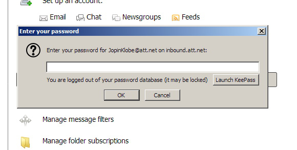 The passwords that I did have there were 'OAuth2' as well as regular passwords both with ATT and AOL. They all worked before with no problems. As I have stated before, I have removed both the outdated password add-on, then, when I installed and tried "KeyBird", it was the one that put up "locked out of the password database" notice.