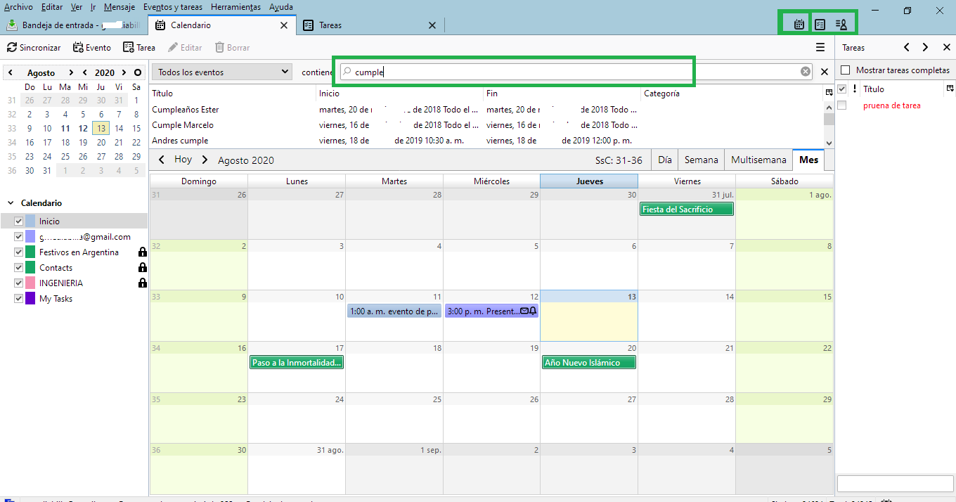 Hola. La búsqueda es muy simple, tengo el calendario sincronizado con el gmail, adjunto una foto de como funciona la búsqueda. No se porque te aparecen los botones griseados quizás algún complemento este afectando su funcionamiento, prueba en modo seguro: https://support.mozilla.org/es/kb/modo-seguro-tb Tu calendario tiene eventos y tareas creados en ese mismo Thunderbird? Saludos