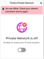 Firefox Private Network says I am offline, and to please check my connection. However, at present, I am online and writing this message.
