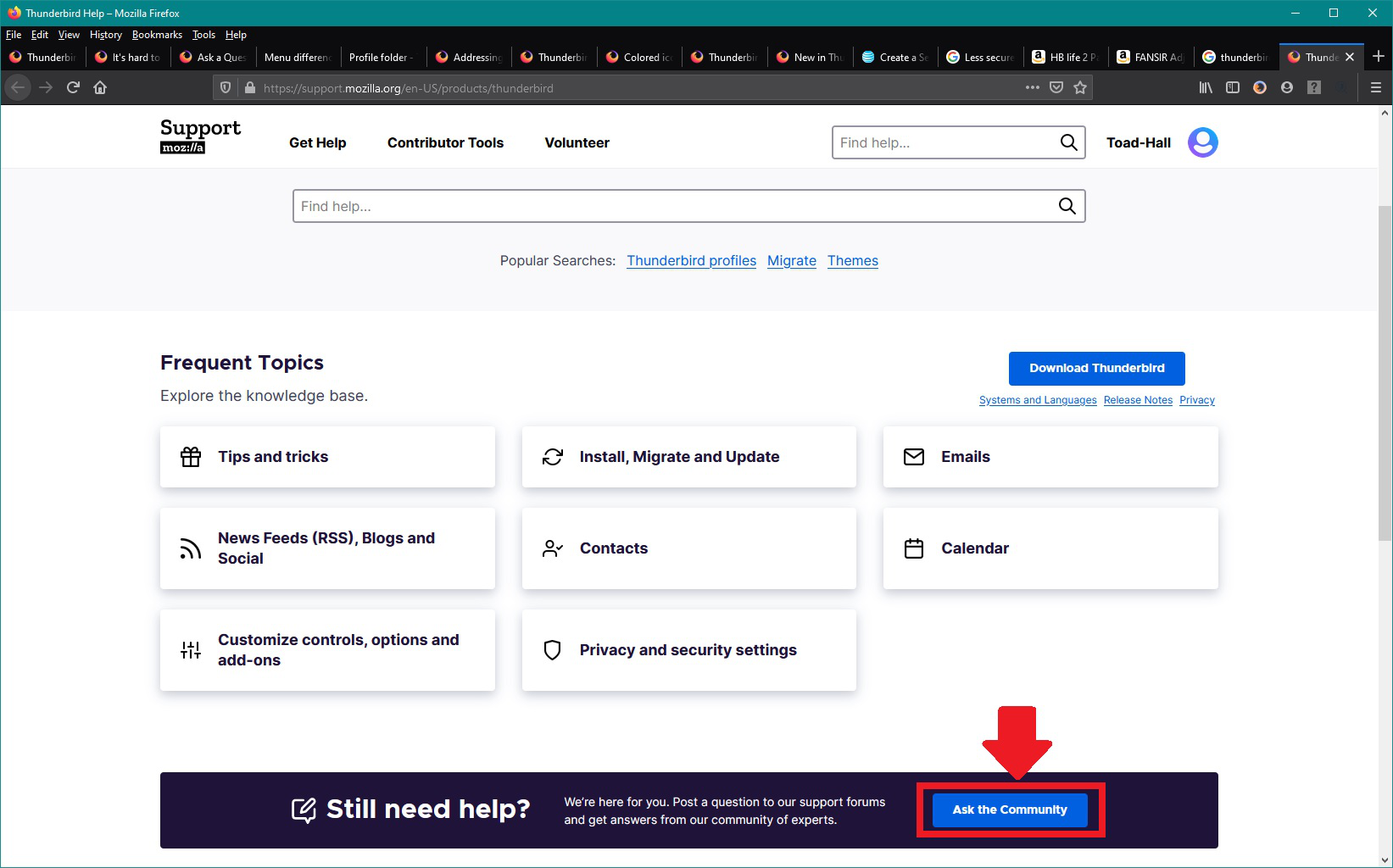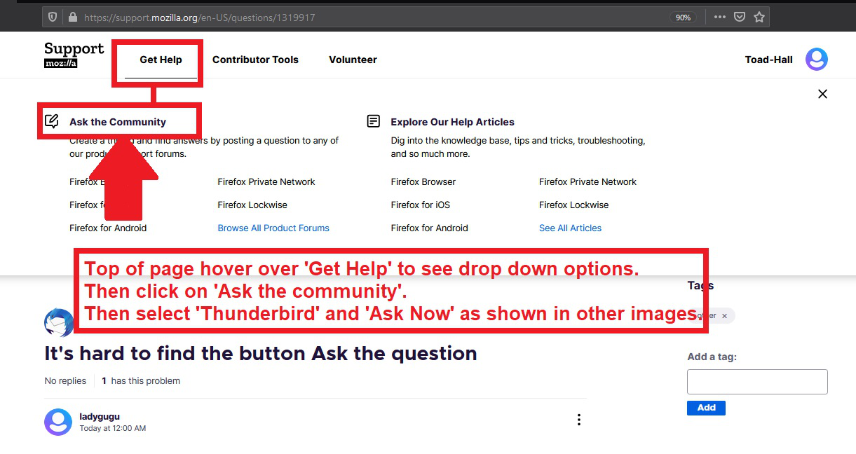If you have been viewing previously asked questions in the forum; such as this webpage; to see if your question has been asked before, but then decide you need to access asking a question: At the top of the webpage click on 'Get Help' to see a drop down for 'Ask the community' - see last image below and this will get you to page where you select 'Thunderbird' and 'Ask Now' as shown in previous images.