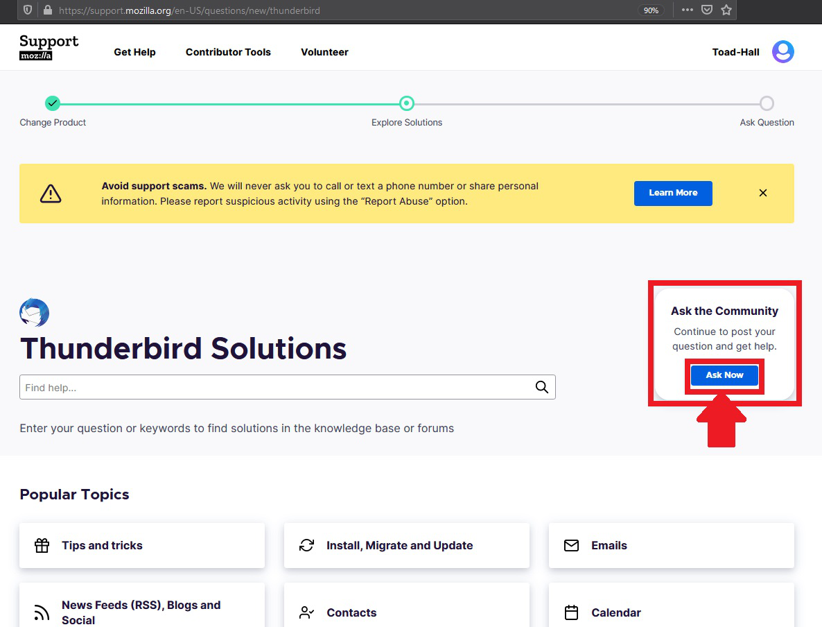 This opens in a browser. You will see various options under 'Frequent Topics'. Below that is 'Still need help?', so click on the 'Ask the community' button - see image below. Select relevant forum - 'Thunderbird' - see second image below. Click on 'Ask now' - see third image below
