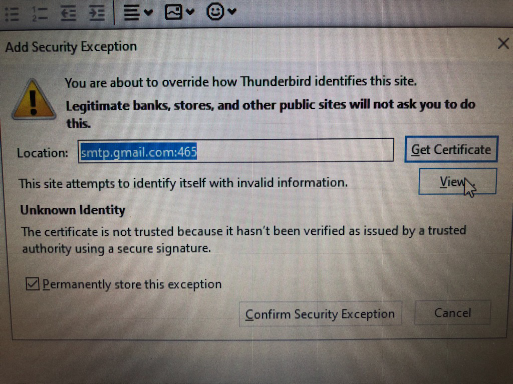 The previous version of TB did not get an invalid certificate for Google's GMAIL SMTP server. The latest version (V78.12)after it was auto updated now gets this error (see attachment). I uninstalled and reinstalled TB. I checked the box to remove all user data when I uninstalled. Gets same error on reinstall and adding account information