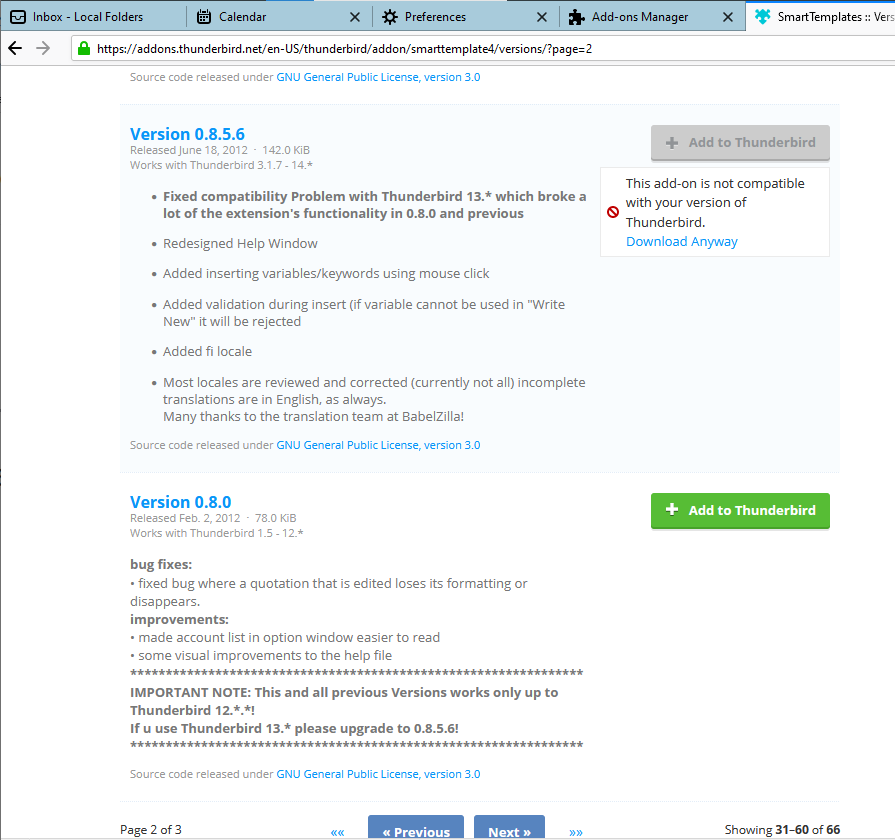 Hi, That is to illustrate the issue I am having. On the first page, all addons as you can see in the first image previously attached, are indicated as not compatible except for the Smart Templates. But if I go and view the version of Smart Templates that is compatible, it is not the latest version but as you say, a version from a decade ago. As you see from the second image previously attached, the newer versions are all not compatible. I have scroll thru all the versions and that is the version the button is green. Attached is image of the latest version mark as incompatible to clarify further. Could the version that my installation reports to the site is wrong? How to check that?