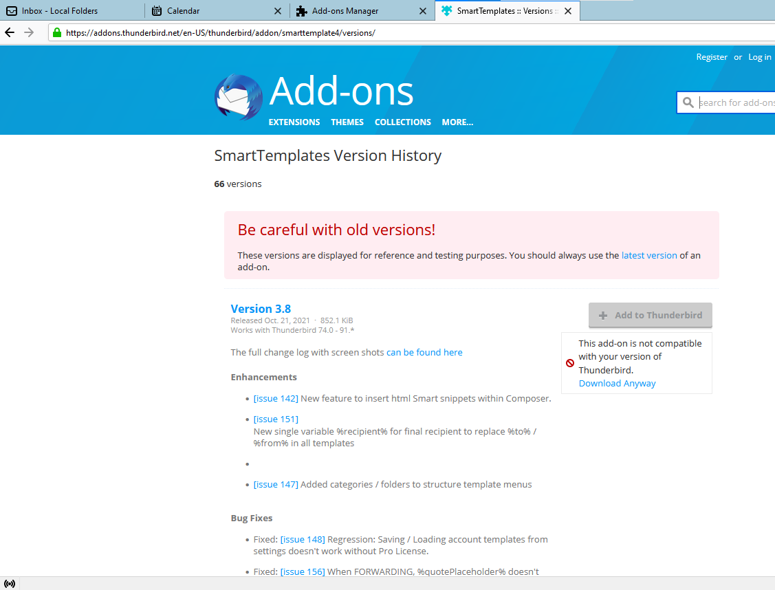 Thunderbird addons site reporting addons incompatible with my Thunderbird 91.2.1 (64-bit) on Windows 10