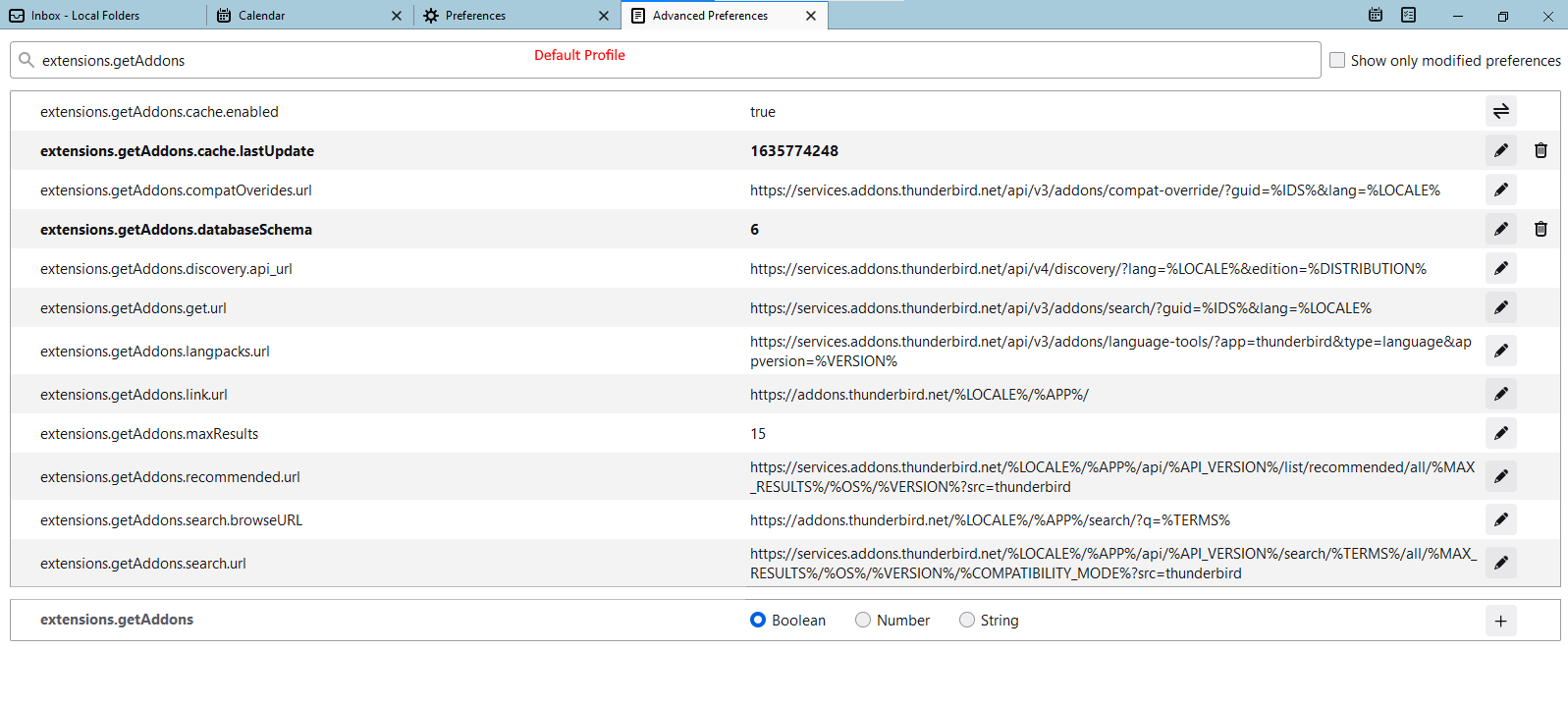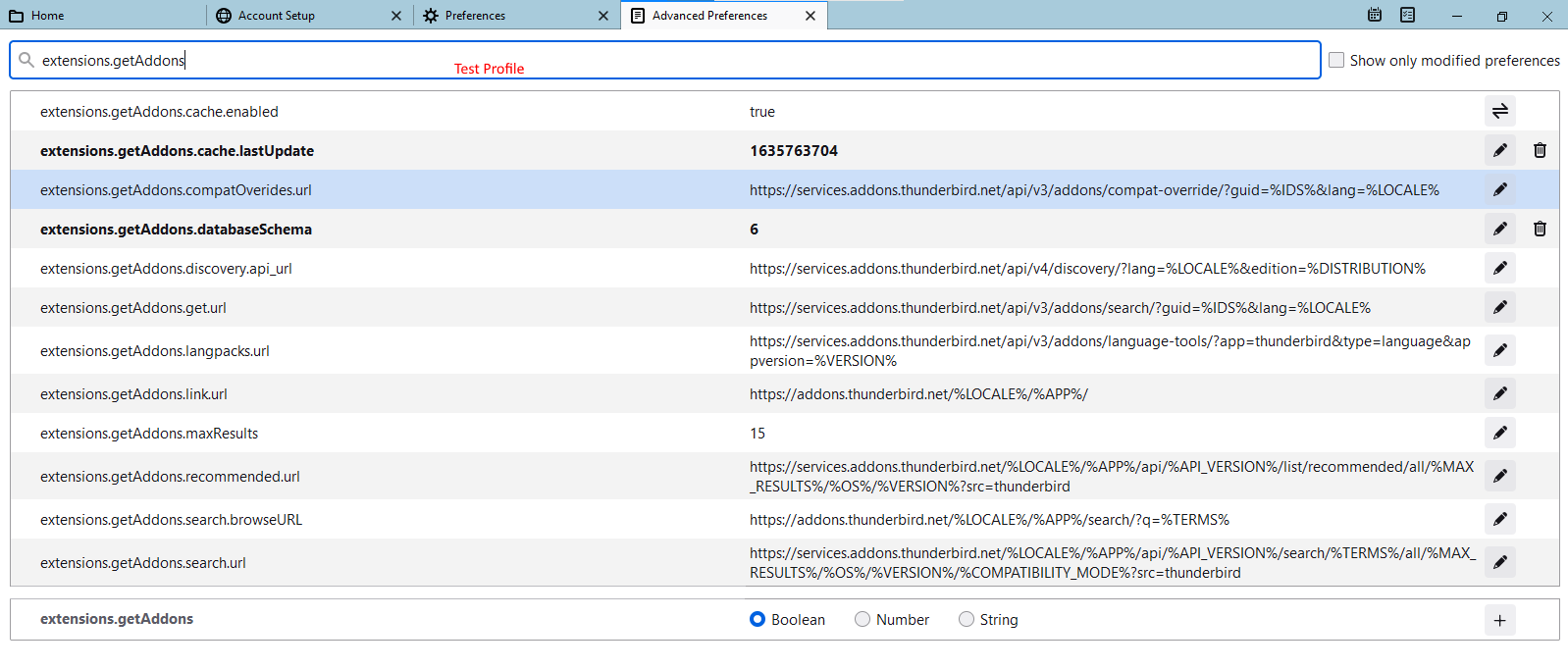 That indeed confirms that something is not right with your old profile. I am not yet sure which preference is responsible for this, but you can do a side by side comparison of the new and old profiles and see what's different between them. Using Config Editor type extensions.getaddons in the search box. This will bring up a handful of preferences that I suspect are responsible for "reporting" Thunderbird's version to the add-on repository. To open the Config Editor, just find and click the button named so in Preferences.