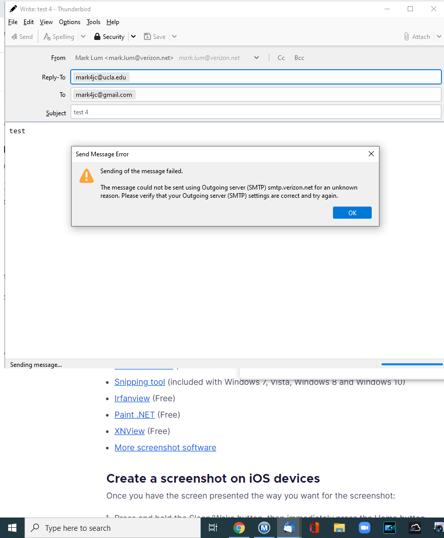 I have an online AOL mail account via Verizon.net. When I try to send a new email via Thunderbird, I get an error message about my SMTP. Started happening around late 2020. I did not have to time to address the issue until now. I am able to receive my emails ok.
