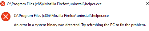 In my system settings, I tried uninstalling the outdated Firefox using the Windows dialog, but I got an error suggesting that I refresh the PC (see screenshot). In my program files, the two Firefox browsers were not differentiated in a way that I could see (c.f. the screenshot of the Windows apps). I am reluctant to run the uninstall helper directly if it might uninstall both versions of Firefox.