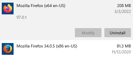 As an aside, the only updated file in C:\Program Files (x86)\Mozilla Firefox\ was a config file, which I think is a surprisingly slight change. Maybe it makes sense that when you go from one version to another you're not making sweeping changes to the application files, but there is a slight disconnect between the 1 KB config file and the 120 MB size difference in the apps. Probably, the config file tells Firefox where to look for all the updates?