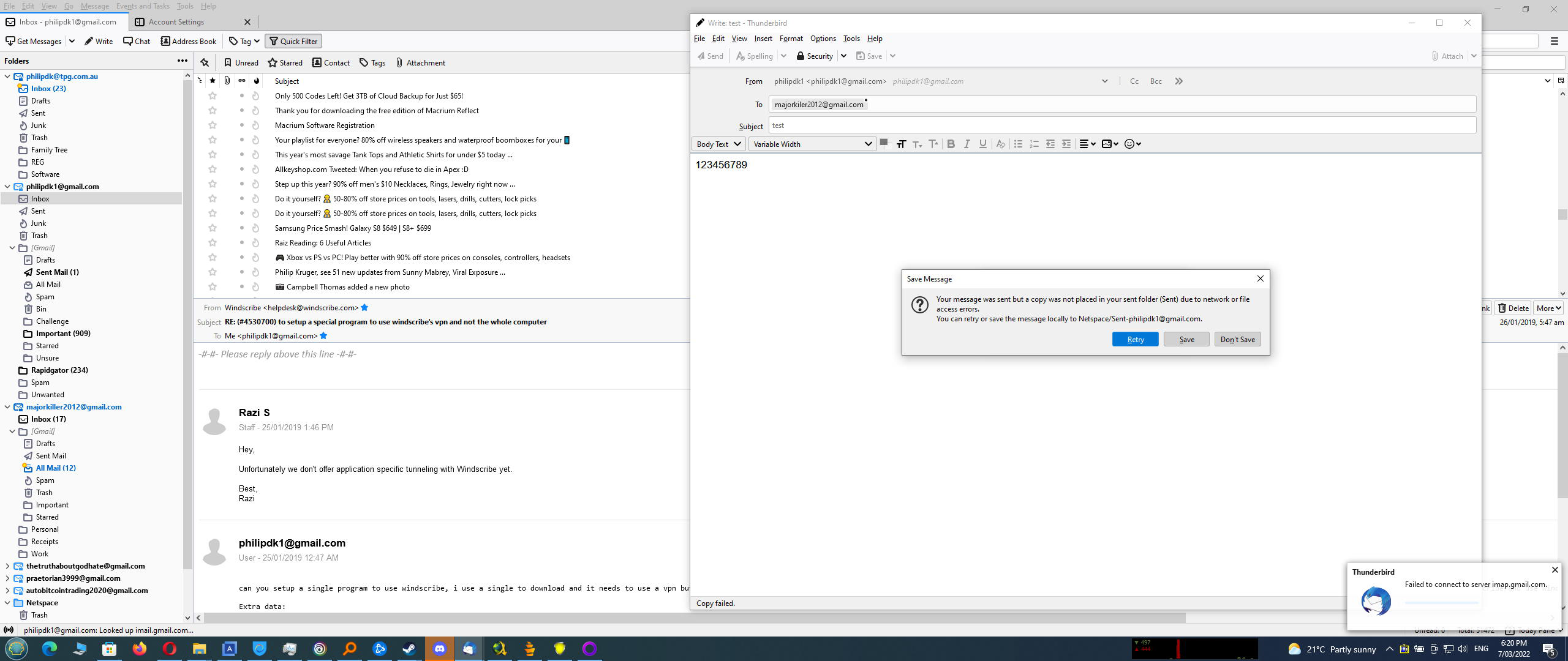 hi i have 2 gmail accounts and one is working and one is not well i think it is not and am getting a weird error message, every time i try to send a message with the account that is not working correctly i get this error i am posting of the screen shot, now i have checked the setting in both email settings and they are the same and i cant work it out