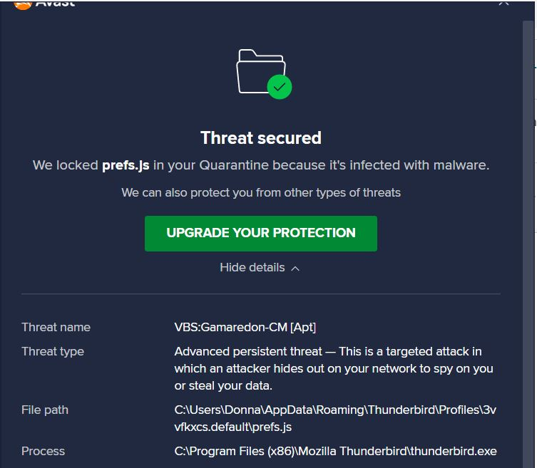 Greetings. Possibly the answer to my question will become obvious on its own, but this is currently "new." Avast has given me the pictured notification, and I am wondering if I now need to repair Thunderbird? [BTW, I have no idea when or how this thing infected my computer. My scans are always fine.]