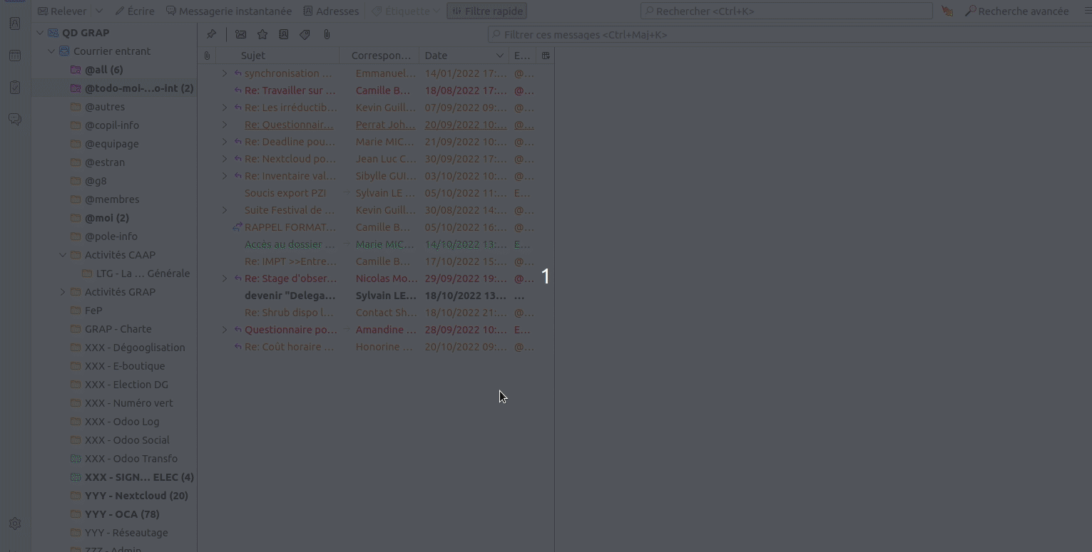 Thank you This solv my problemm For "grouped" mails, it's a parameter called "threaded" that you can change here : Menu > View > Sort by > do not group It's the penultimate option Is there any way to change all folders at once? Or do I have to change one by one?