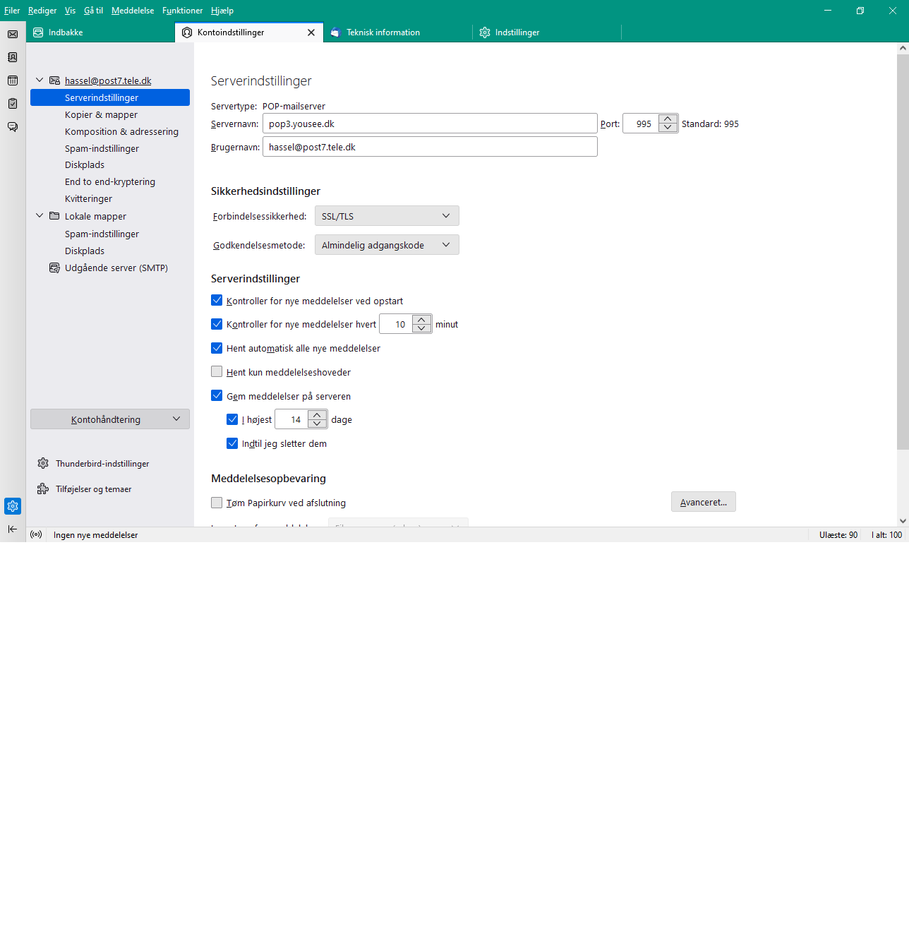 Hi I am not able to send emails even though I have followed the instructions on Mozillas Support. I receive a message saying, that I should go to my providers webpage to look for the solution. Here it said that I should update my password, which I have done. But maybe there is a problem with the outgoing email. I opened Thunderbird settings, found the hidden passwords and realised there wasn’t any for smtp? The problem concerns hassel@post7.tele.dk, and as you can see in the picture there is a line for the mailbox with a POP3, but no line for smtp for outgoing mails. What should I do? Monica Hassel hassel@post7.tele.dk Info: Portnumbers are from Yousee. Thunderbird 102.4.1 (64 bit) Provider Yousee Norton 360 Windows 10