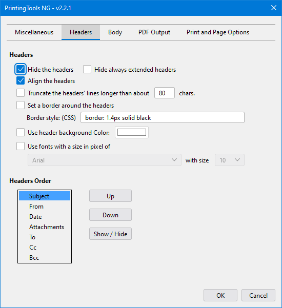 The headers can be customized or hidden entirely with the Printing Tools NG add-on (see picture).