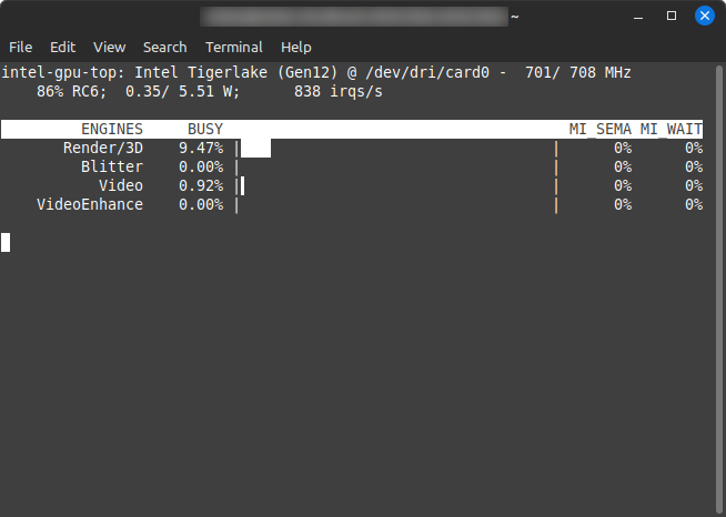I am using YouTube on an ASUS ZenBook UX425EA, which runs Linux Mint 21.1 and has an Intel Core i7-1165G7 CPU. This chip supports AV1 hardware decoding through the integrated GPU and I followed these instructions to get VP9 decoding working. Checking intel_gpu_top while viewing a VP9 video (as confirmed by Stats for Nerds) show that the video core is being used, while watching an AV1 video shows that the power is being shifted to the Render/3D core.