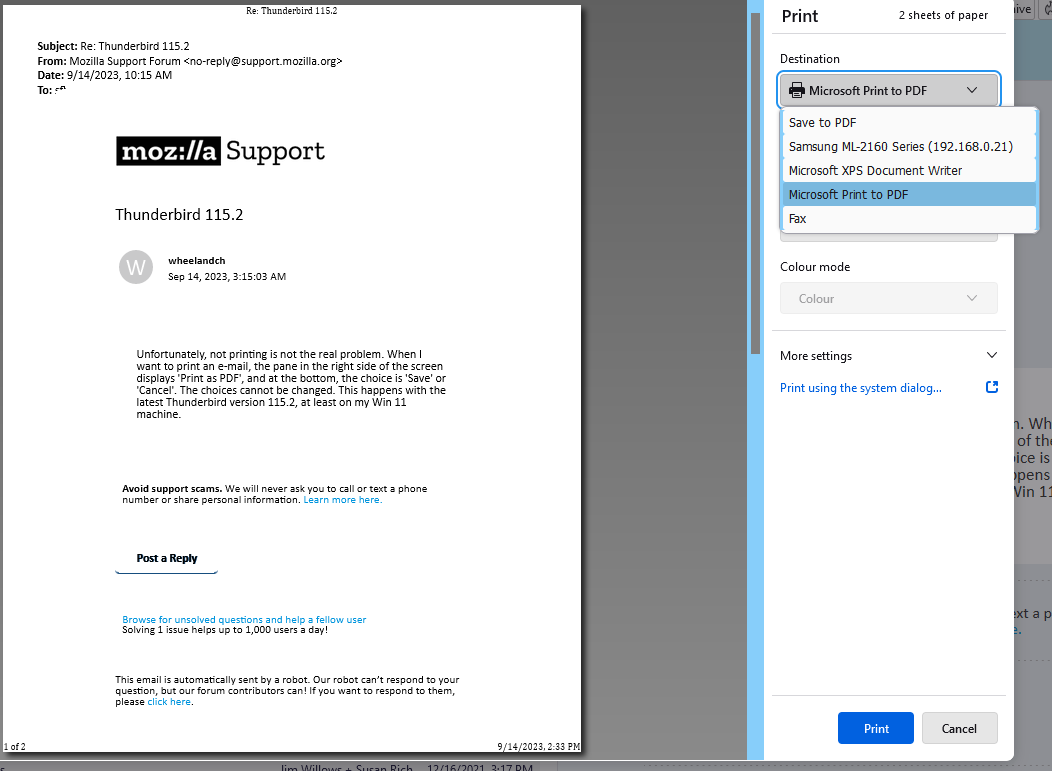 There are PDF drivers installed. My drop down pane displays; At the top, Print. Destination: Save to PDF-only. At the bottom where 'Print' used to be is Save or Cancel. These settings are not and cannot be changed. This only happened when I upgraded to 115.2 Thunderbird. I have cleaned out the cache, messed with running as Administrator and nothing has changed. Beginning to think there is a fly in the program.