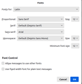 Thanks for reply. I tried modifying the settings you suggested but they had no effect on how the text is displayed in the message creation/editor window. When I write a new message with the font set to Arial and size set to medium, the size of the text on screen is very small - like a font size of 4 or 6. I can zoom the editor window and that gives me what I'm looking for but it seems to be a volatile setting so it resets every time I open the editor. Is there a setting somewhere that sets the relationship between the font size selected (Small, Medium, Large etc) and the size of the text as shown in the editor window on screen. I think that's what I'm looking for. Kevin