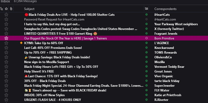 I do prefer the windows task bar in black, so I try not to fiddle with the windows theme defaults much, but there are many free themes in the Microsoft store for windows and all of them may change the way Thunderbird displays lists depending if they are based on a dark theme or a light one. So I also set the windows display to always use light themes for applications.