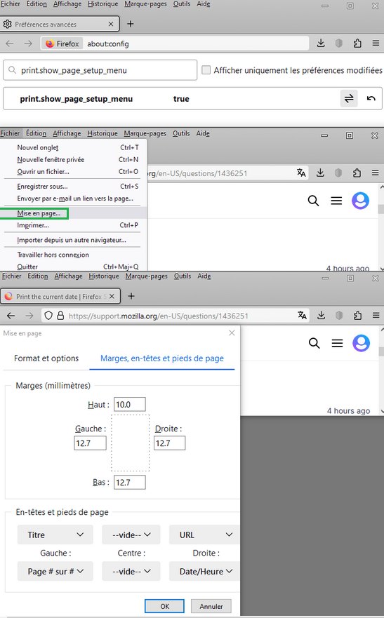 Other for information Configuration Editor for Firefox https://support.mozilla.org/en-US/kb/about-config-editor-firefox Search preference name print.show_page_setup_menu Try true