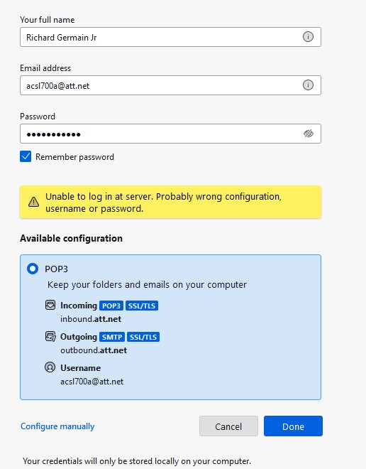 Have been attempting to add my AT&T email account to Thunderbird without any success. After 3.5 hours and after trying to understand online documentation that is like reading Finis I have thrown in the towel and I am asking for help! I have auto configuration and manual configuration and the snowy slopes of Finland have won hands down! I have attached screens shots of what I have attempted.