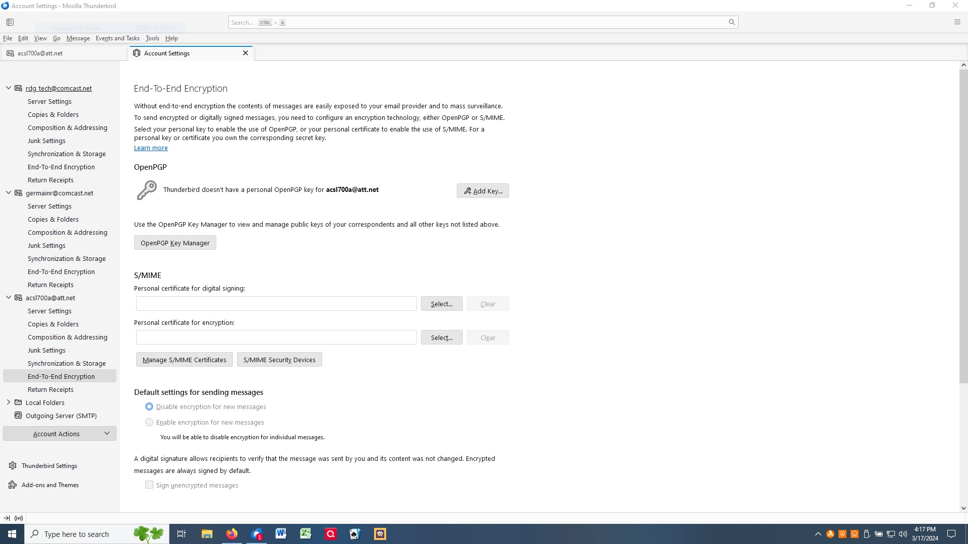 Thanks for your help. I login to the AT&T website and created secure mail key. Now the problem I am unable to insert the secure key into Thunderbird. It keeps asking to create a key or insert a key. Thunderbird is looking for a key with a ".xxx" at the end of the secure key. AT&T does not create a key with a suffix. I have the AT&T key how my I insert the key?